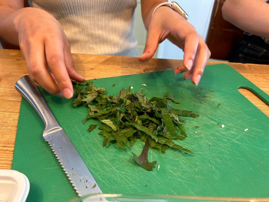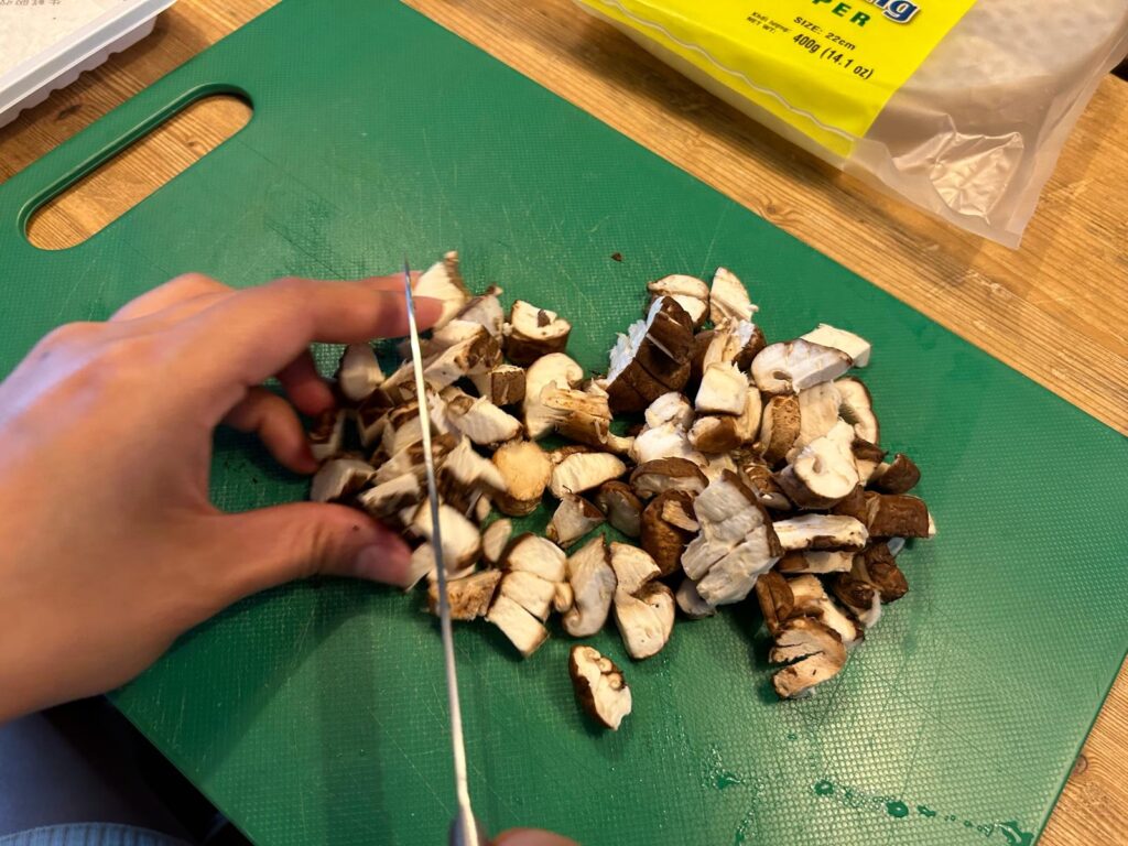 - Snijd de shiitake en bosui in kleine stukjes, en optioneel de shiso en/of garnalen.