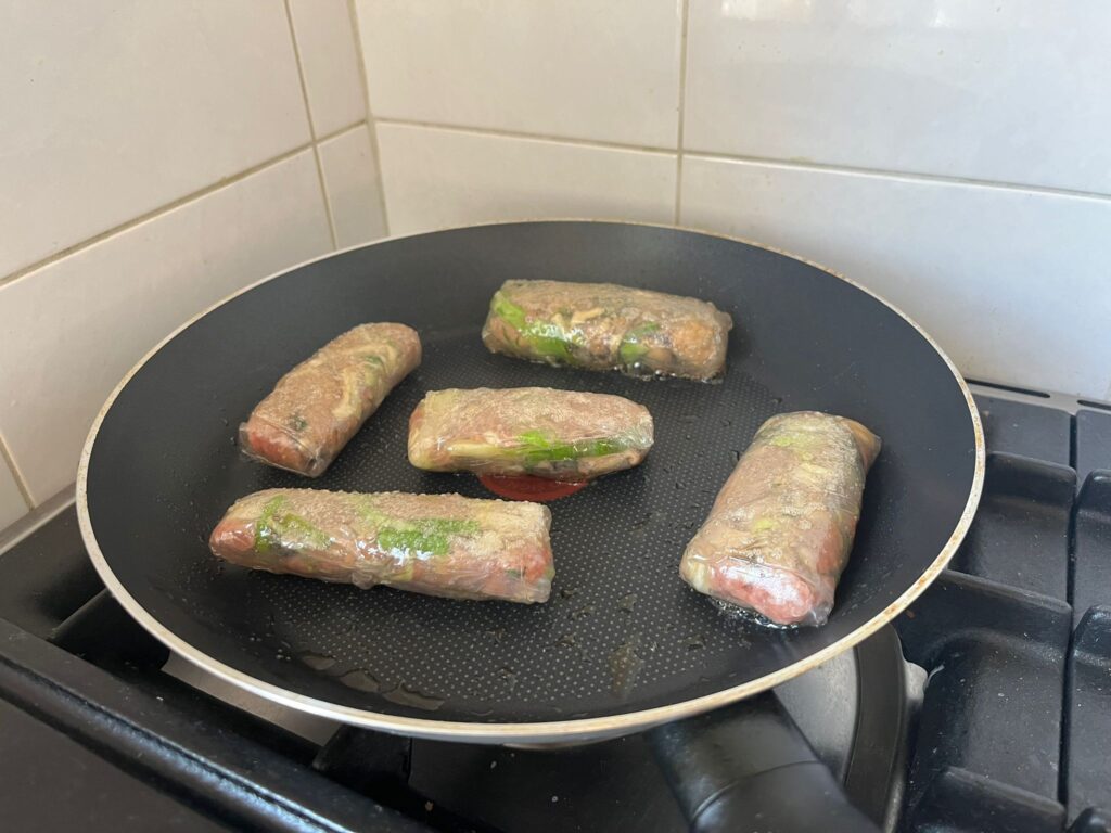 Je maakt de glutenvrije gyoza met rijstpapier in plaats van het gyozadeeg. Je legt de ingrediënten voor je in het midden van het rijstpapier, rolt ze twee keer op en vouwt de zijkant dicht. Daarna rol je ze helemaal uit (net zoals je loempia’s maakt!).