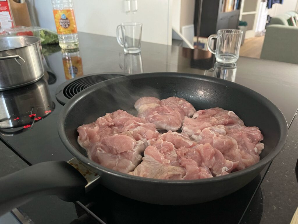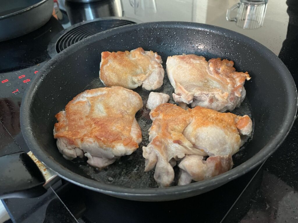 - Voeg een klein beetje olie en bak de kip – bak eerst de kant van het vel en wacht totdat het knapperig wordt. Draai de kip dan om, en bak de andere kant.