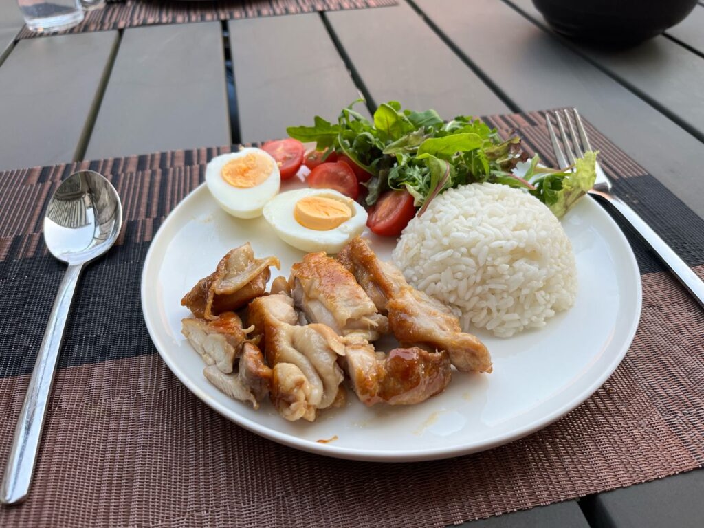 - Zet alle ingrediënten op het bord neer (de rijst, kip, tomaatjes, sla) – je kunt dit ook in een kom doen zoals bij een poke-bowl.